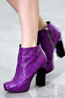 Filigree cages wrapped stiletto heels at Ralph Lauren; Seventies wood vinyl prints came into play atRochas; layers of coloured sand filled hollow Perspex heels at Rodate; while models were teetering around on icy stalagmites atChanel. In contrast to the bright tweed of Erdem's boots, Nicholas Kirkwood incarnated his in Constructivist style for the designer - bolting on Perspex blocks with screws deliberately left on show.